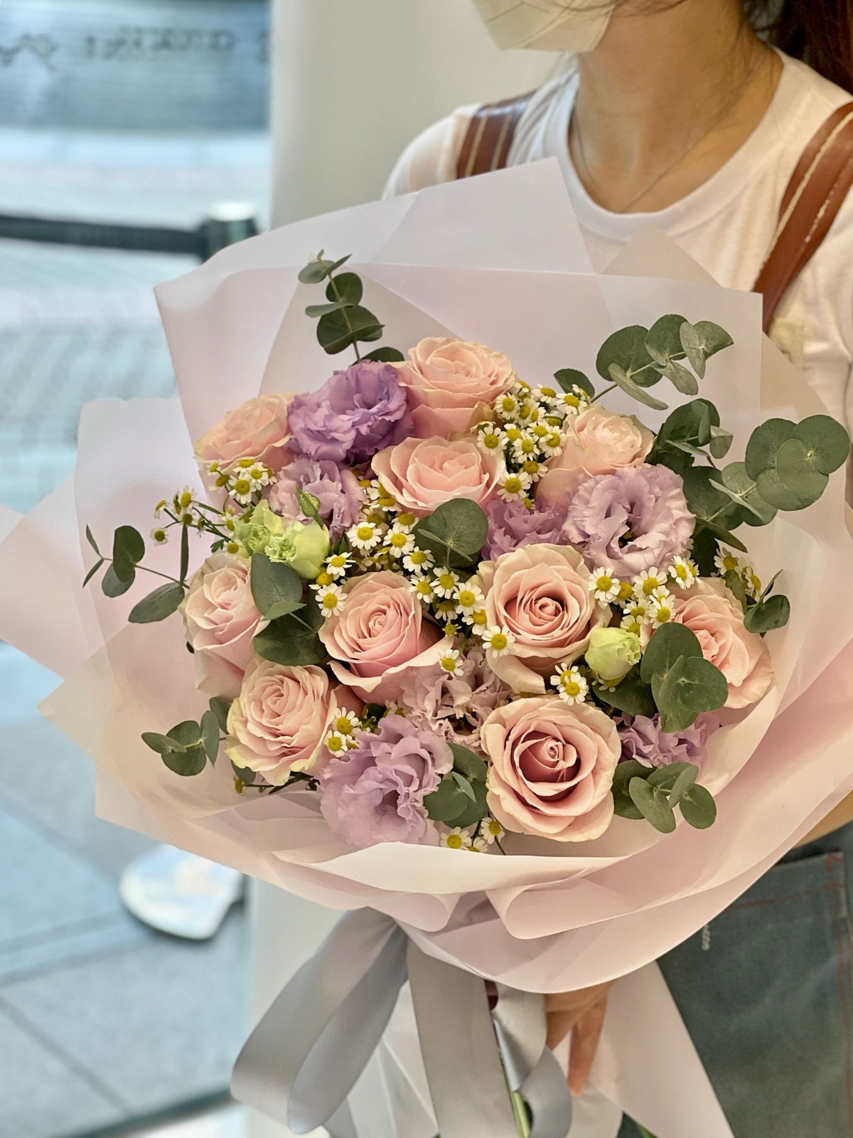 花包括:玫瑰、洋桔梗、洋甘菊和尤加利